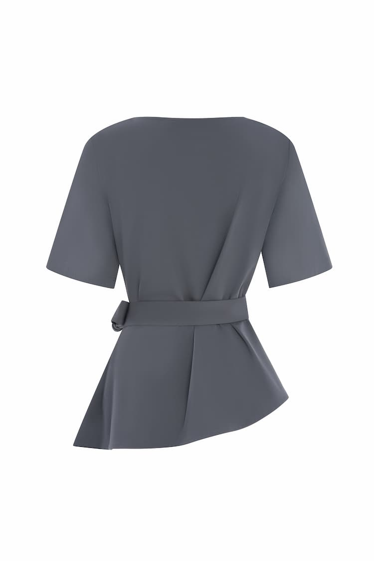 EMANUEL ASYM TOP z kolekcji SET by Karina Barszczewska to bluzka medyczna damska zaprojektowana jako autorski uniform medyczny lekarki, stworzony dla kobiet poszukujących eleganckiej odzieży do pracy w medycynie i branży beauty.