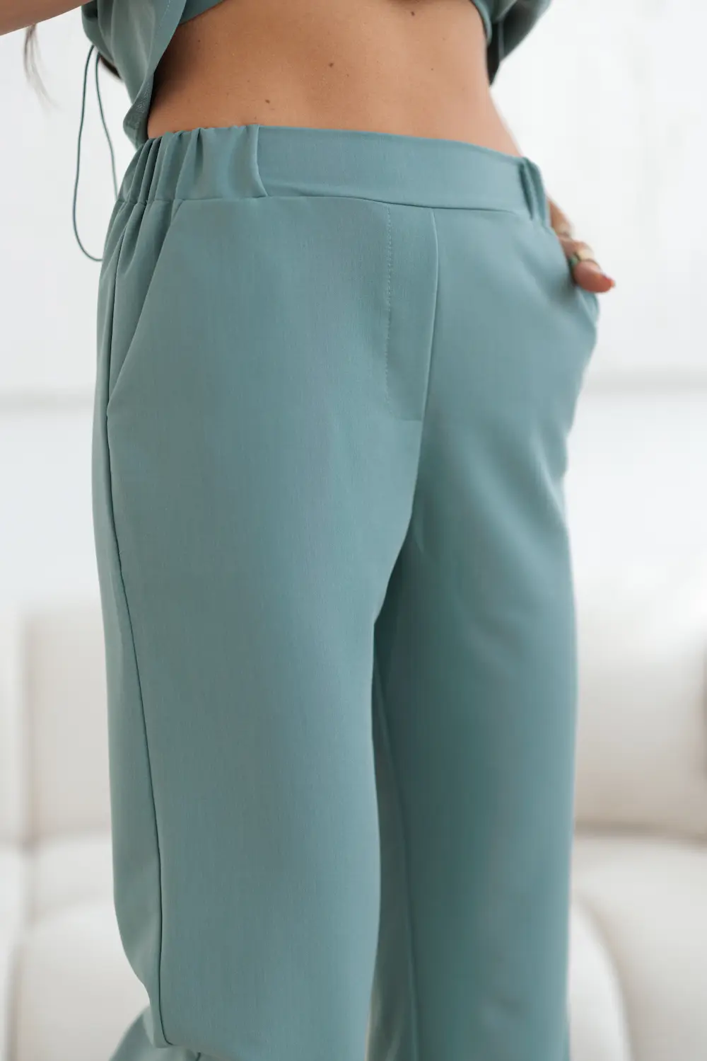 Komplet wykonany z nowoczesnej mieszanki włókien: 78% poliester, 19% wiskoza, 3% elastan – tkanina jest elastyczna, szybkoschnąca, odporna na zagniecenia i częste pranie.