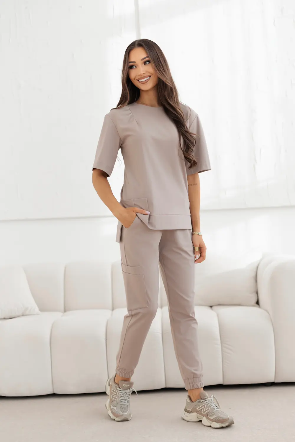 Komplet medyczny MIA w kolorze marchiano beige piękny odzień beżu to nowoczesna propozycja dla kobiet, które cenią funkcjonalność i estetyczny, profesjonalny wygląd w codziennej pracy. Chłodny odcień szarości nadaje stylizacji elegancji i uniwersalnego charakteru.
