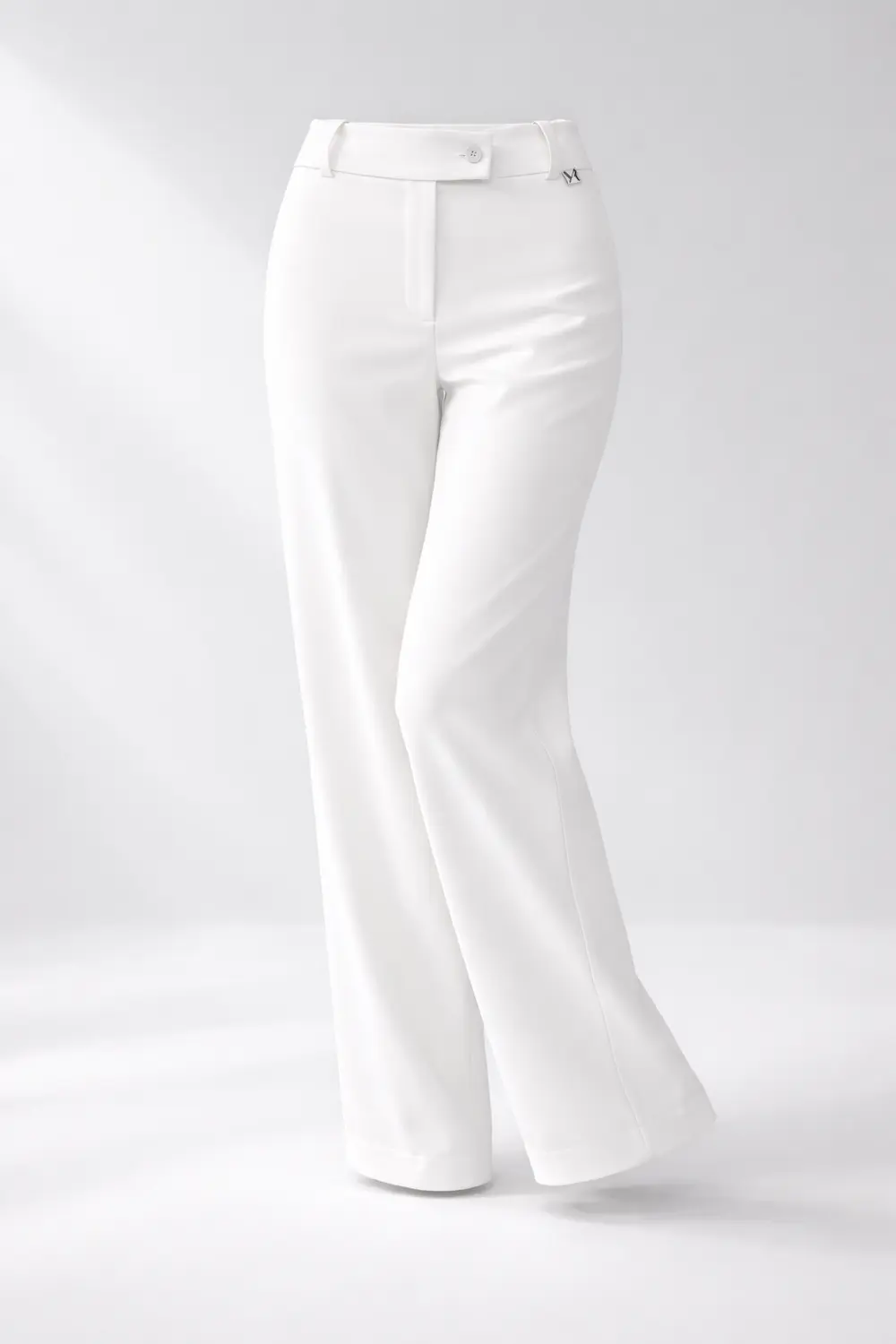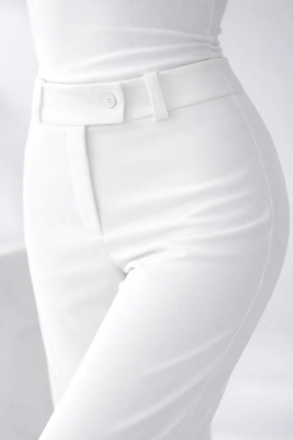 Góra spodni została dopracowana tak, aby zapewnić estetykę i wygodę przez cały dzień: przedłużone zapięcie elegancko zasłania zamek, a konstrukcja obejmuje jeden guzik kryty oraz jeden widoczny.