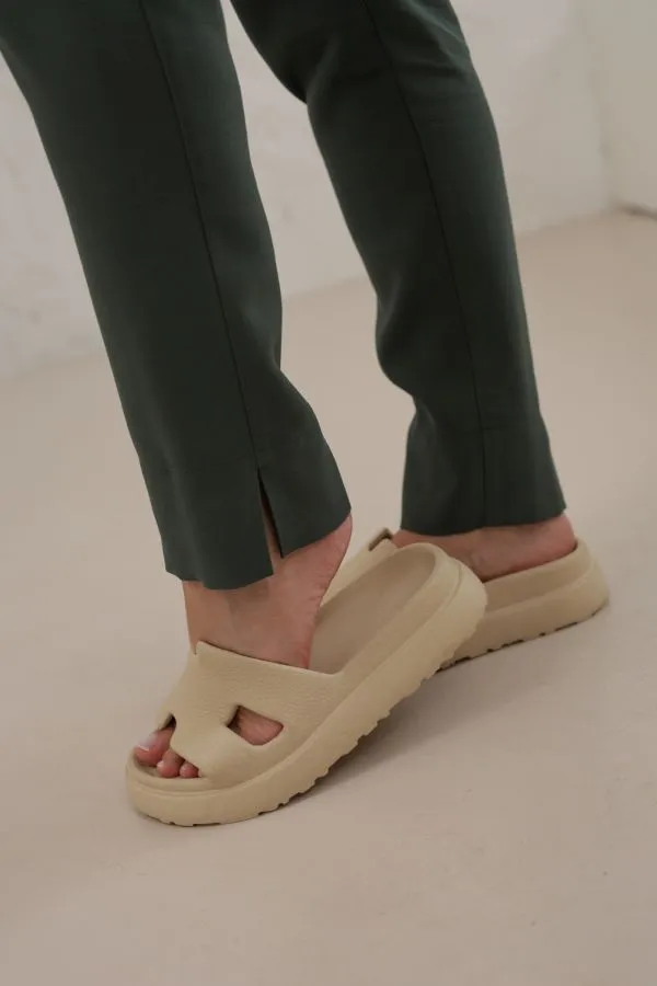 • Zwężane nogawki z subtelnym rozcięciem – optycznie wysmuklają sylwetkę